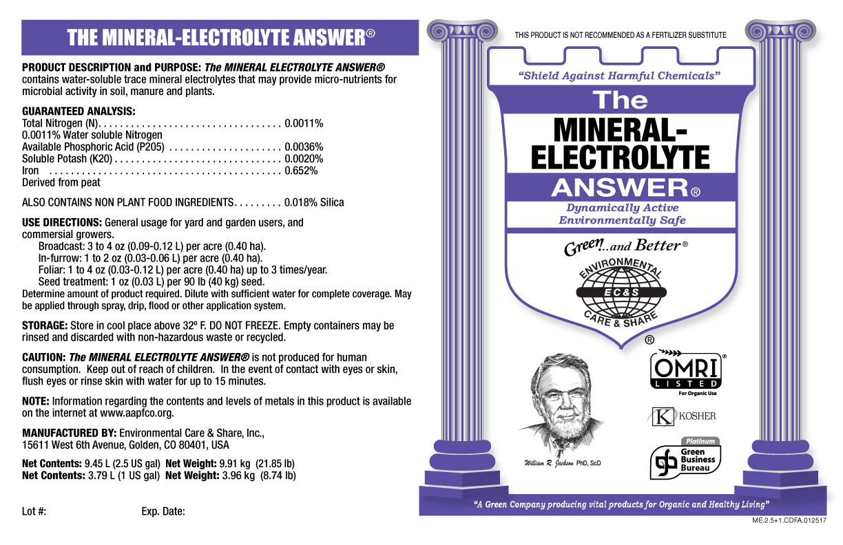 THE MINERAL ELECTROLYTE ANSWER® is packaged into a 2.5 gallon as a liquid form; Weight: 20.5 lbs (9.4 Kg) per container and 36 cartons (180 gallons) per pallet. Please feel free to ask your consultant