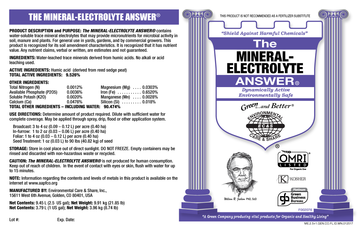 THE MINERAL–ELECTROLYTE ANSWER® contains organic electrolytes (fulvic acid), essential micronutrients, trace minerals, chelated minerals and nutrients in bioavailable form, serves as an outside electrical force. THE MINERAL– ELECTROLYTE ANSWER® stimulates microbial activity in soil. It can mimic functions of some plant growth regulators when applied properly, chelates minerals and other soil nutrients, enhancing their availability for plants. It reduces compaction and increases oxygen in soil by improving soil tilth. THE MINERAL– ELECTROLYTE ANSWER® helps water penetrate and permeate plant cells, assisting nutrient uptake and water storage during drought conditions, as well as balance water and assisting plant transpiration, the transport of water and nutrients of the cell tissues.