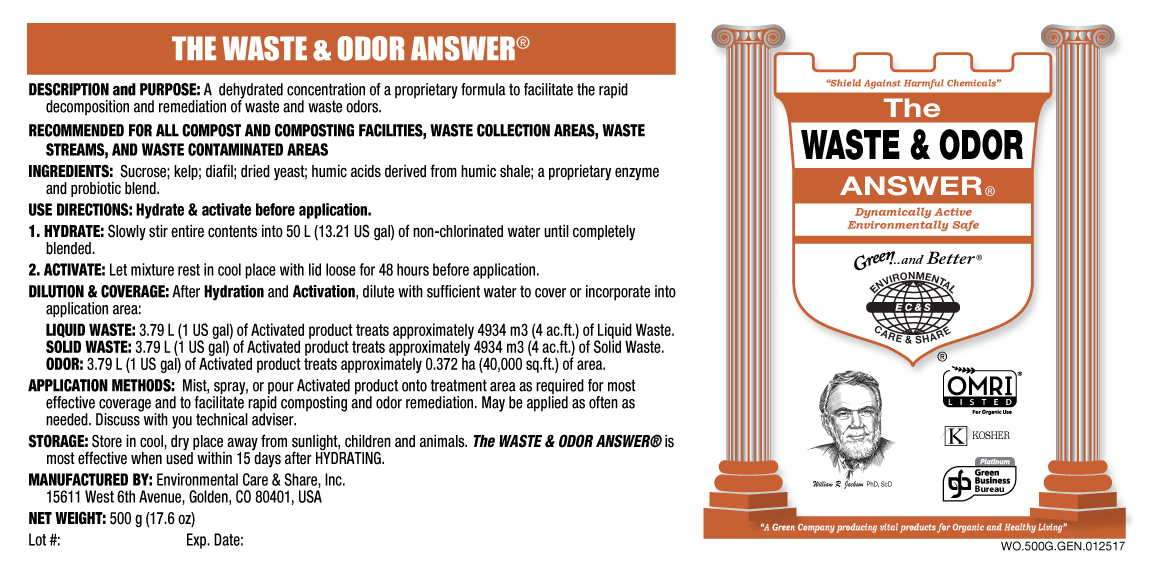 THE WASTE & ODOR ANSWER® is a dehydrated concentration of a proprietary formula to facilitate the rapid decomposition and remediation of waste and waste odors.